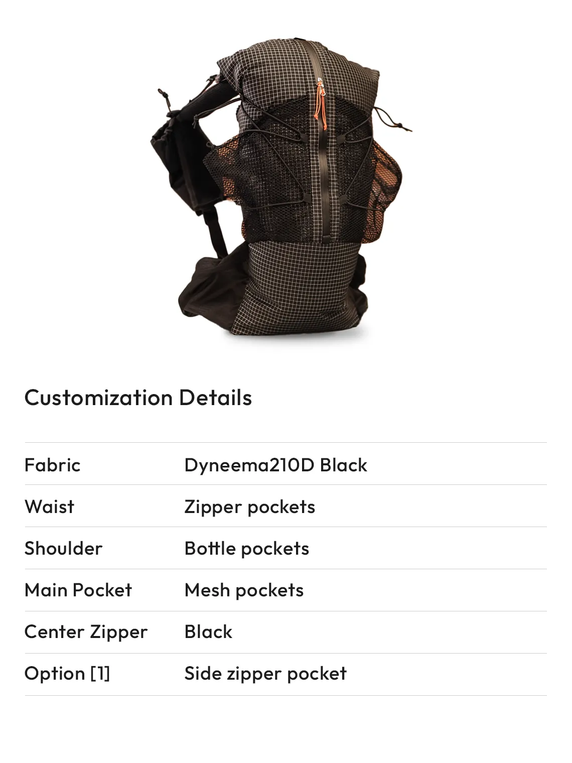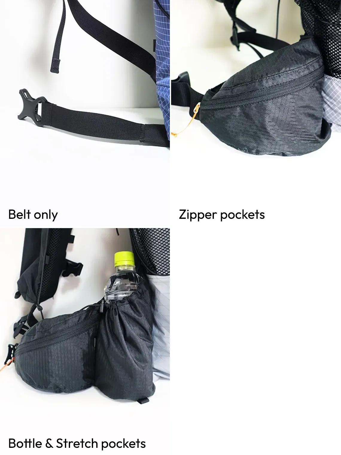 Optional additions include a waist belt, zip pockets, bottle pockets.