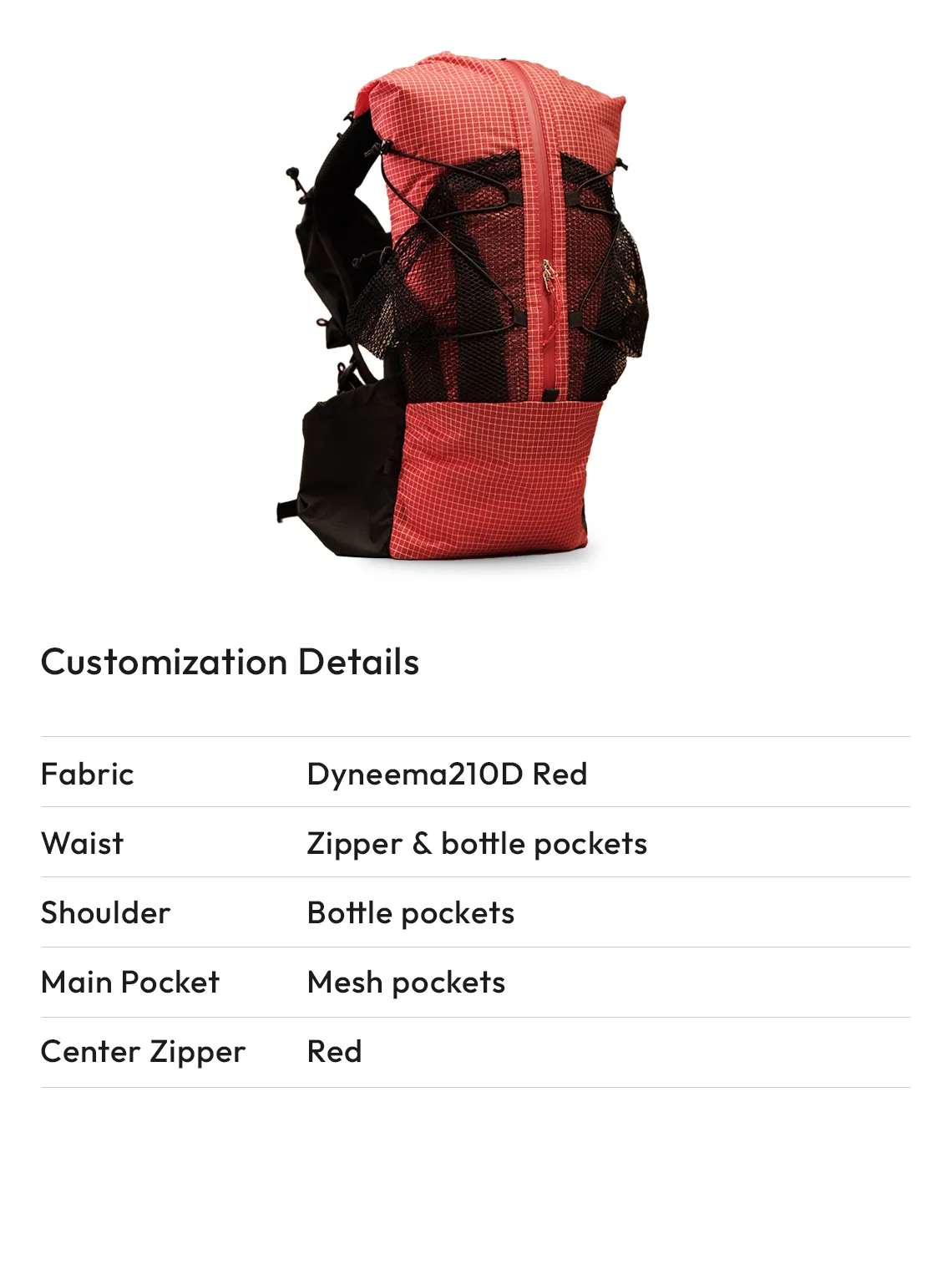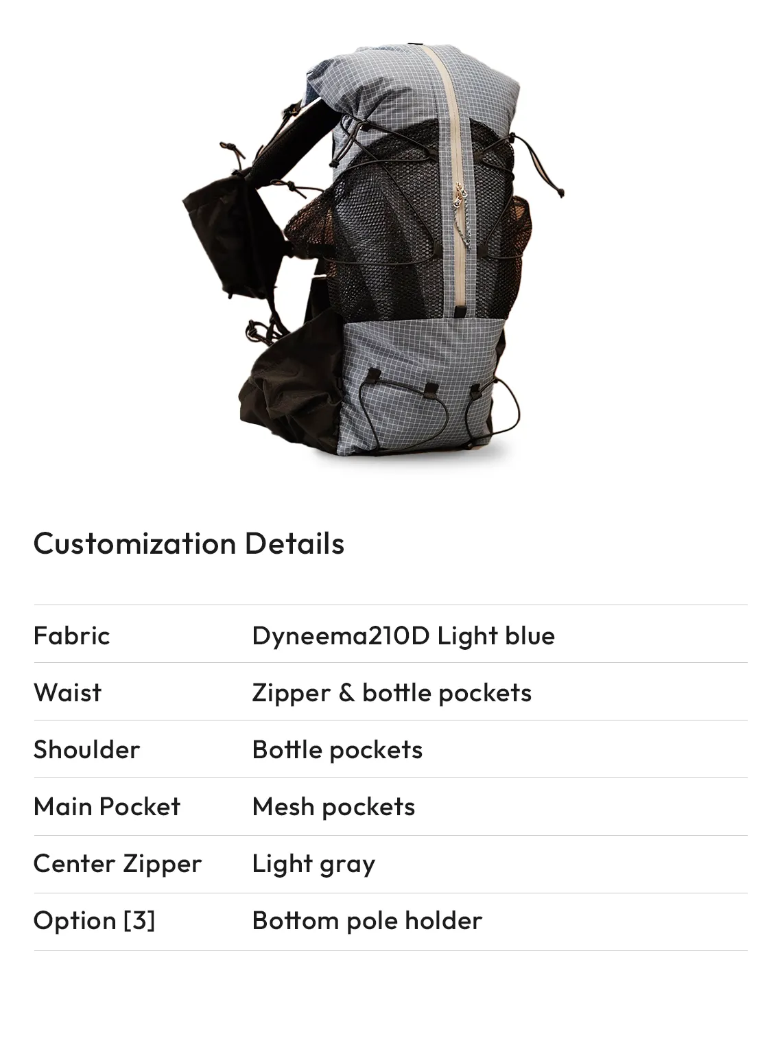 You can choose the type and color of the base fabric for your backpack from options such as 70d Ripstop, Dyneema 140d/210d, and ULTRA200.