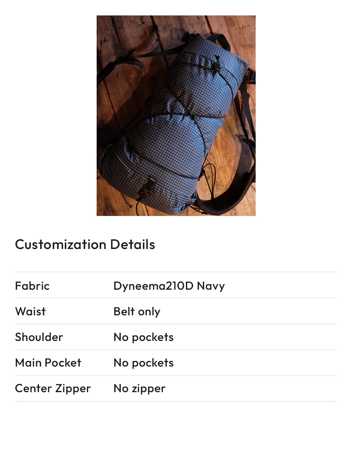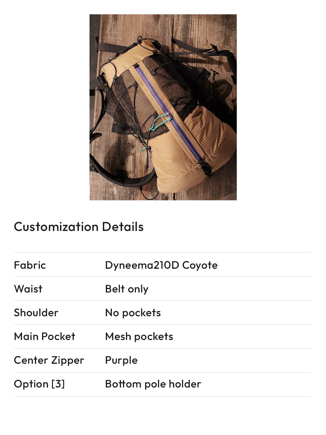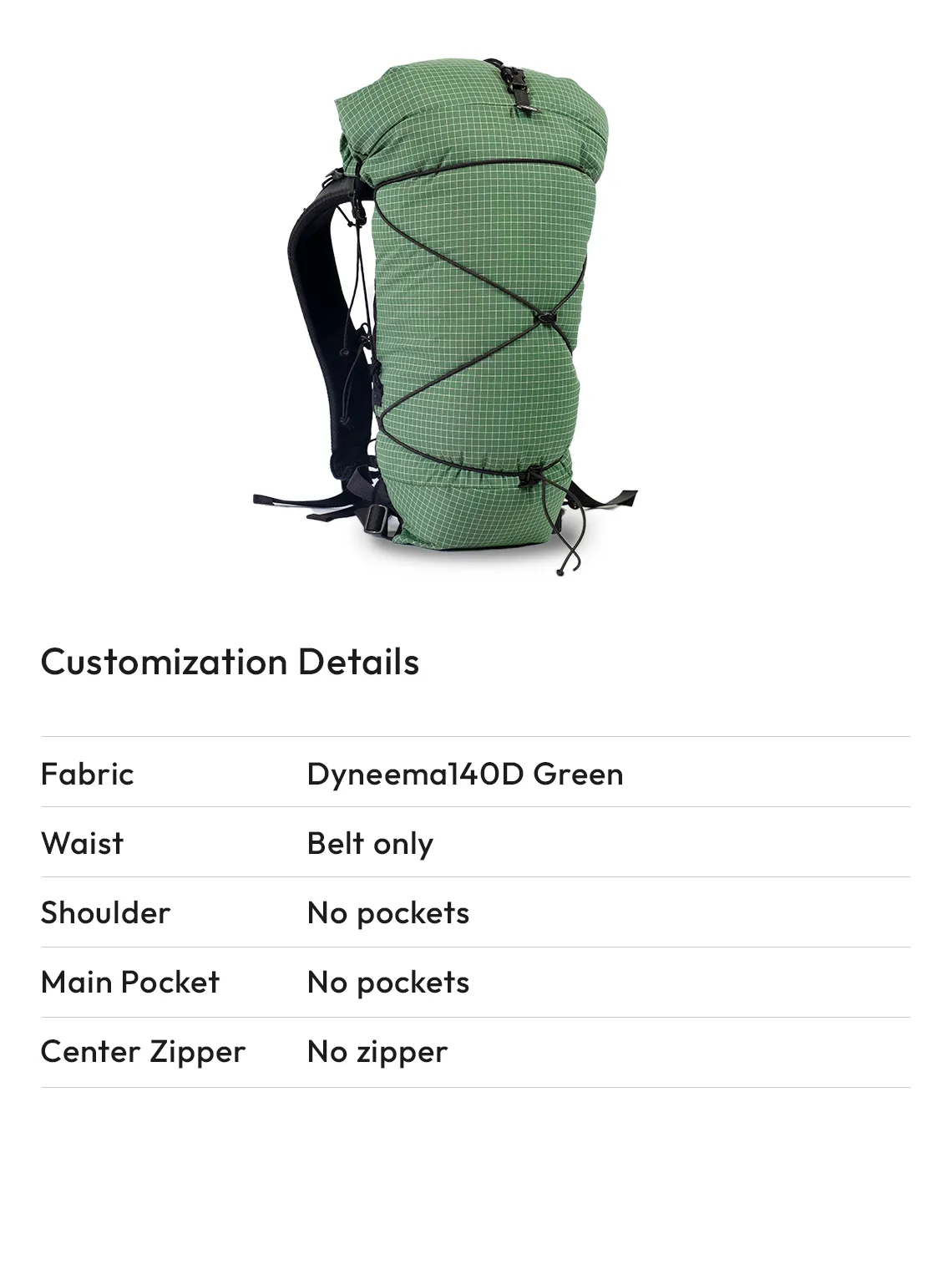 You can choose the type and color of the base fabric for your backpack from options such as 70d Ripstop, Dyneema 140d/210d, and ULTRA200.