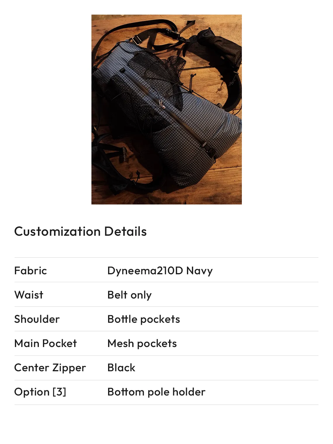 Optional additions include a waist belt, zip pockets, bottle pockets.