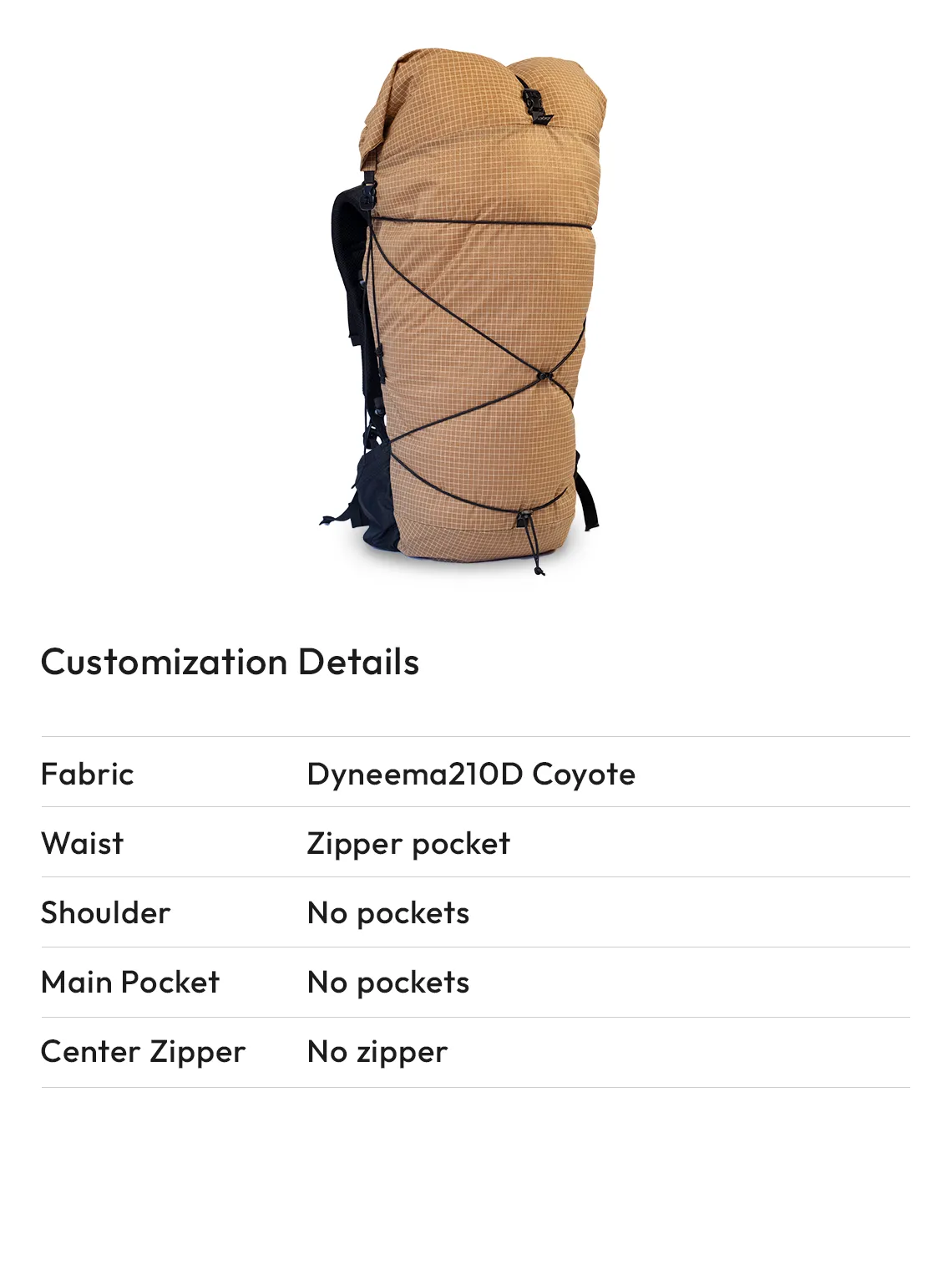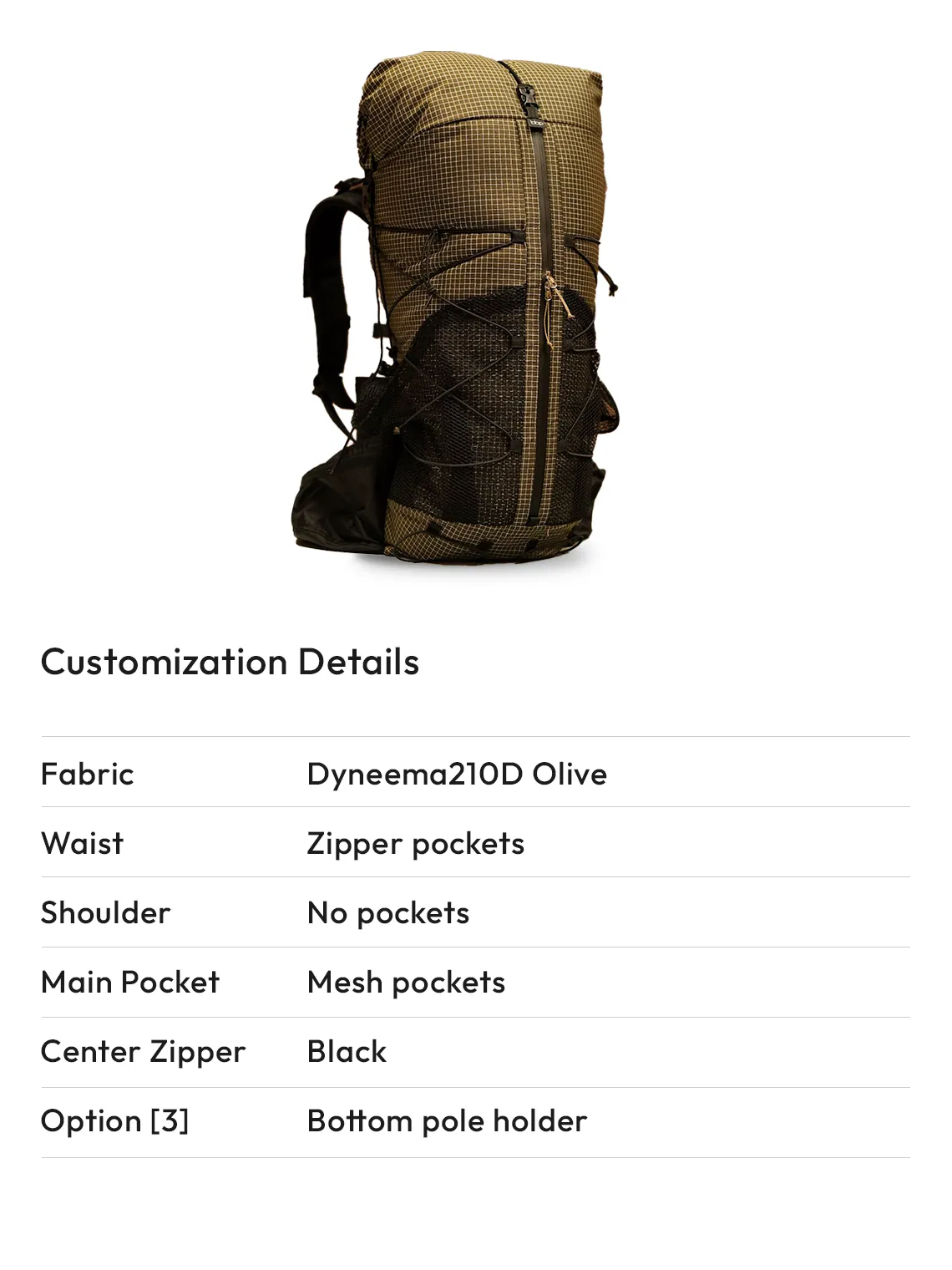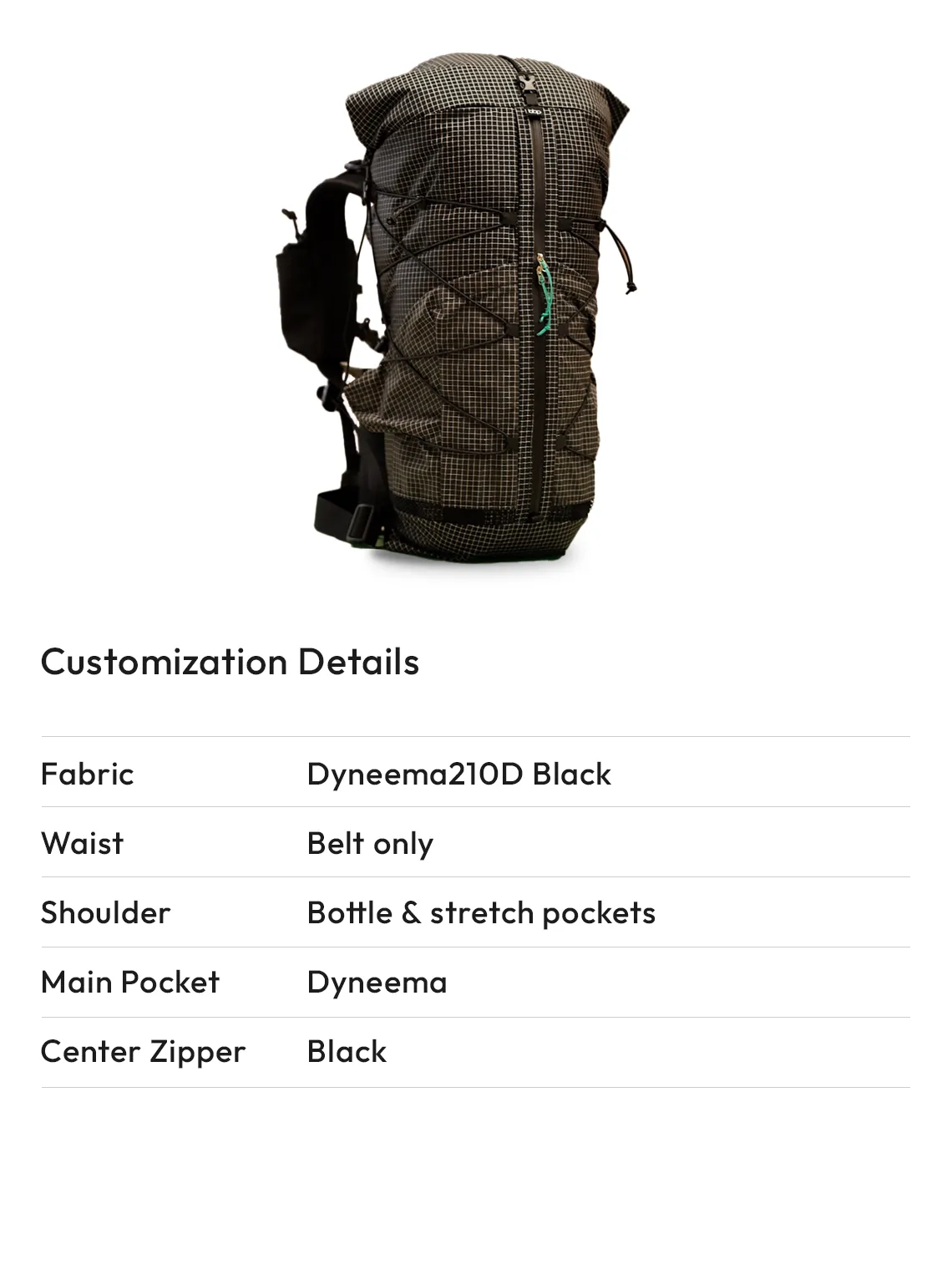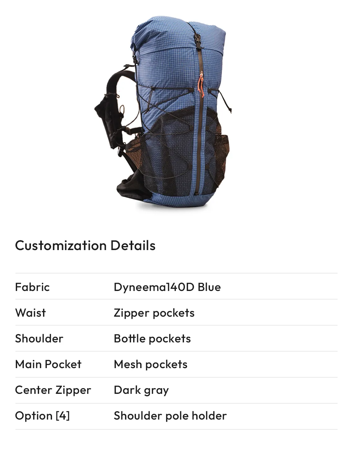 - You can choose the type and color of the base fabric for your backpack from options such as Dyneema 140d/210d, and ULTRA200.