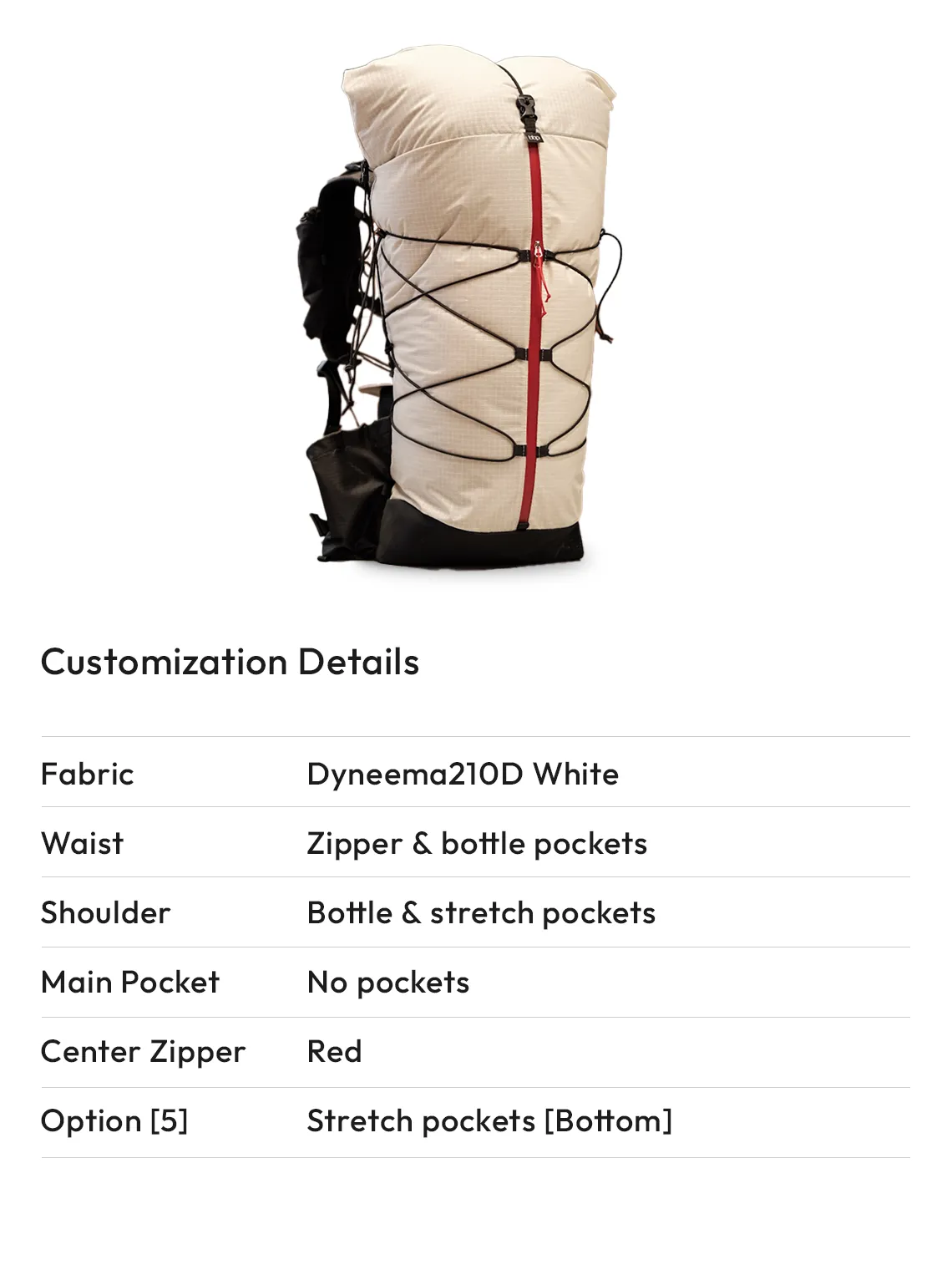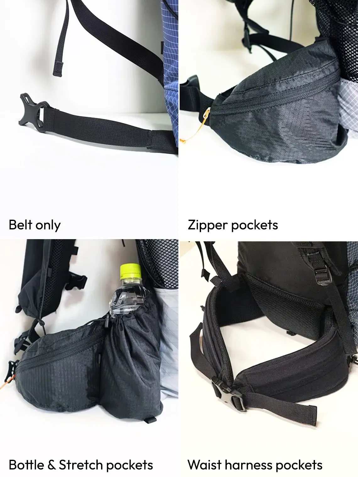 - Optional additions include a waist belt, zip pockets, bottle pockets, and a waist harness.