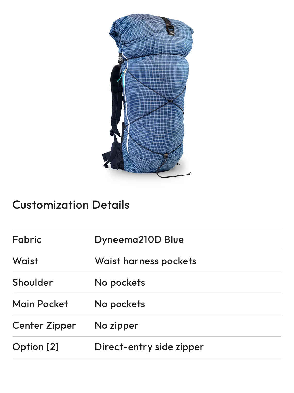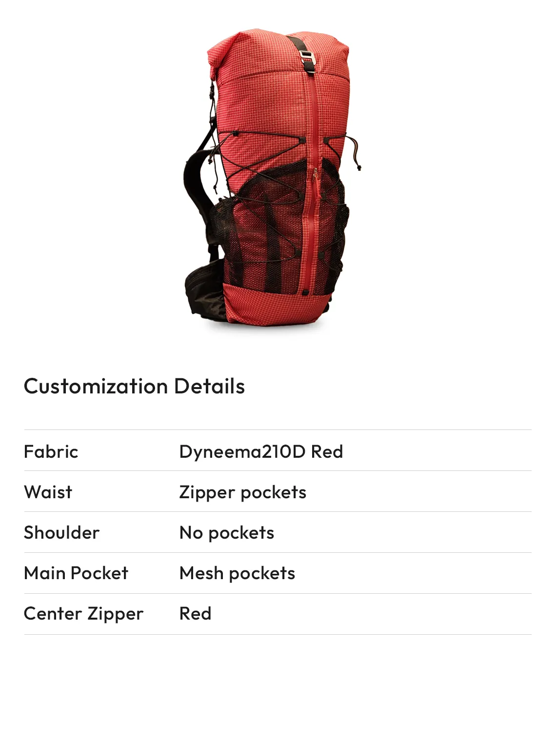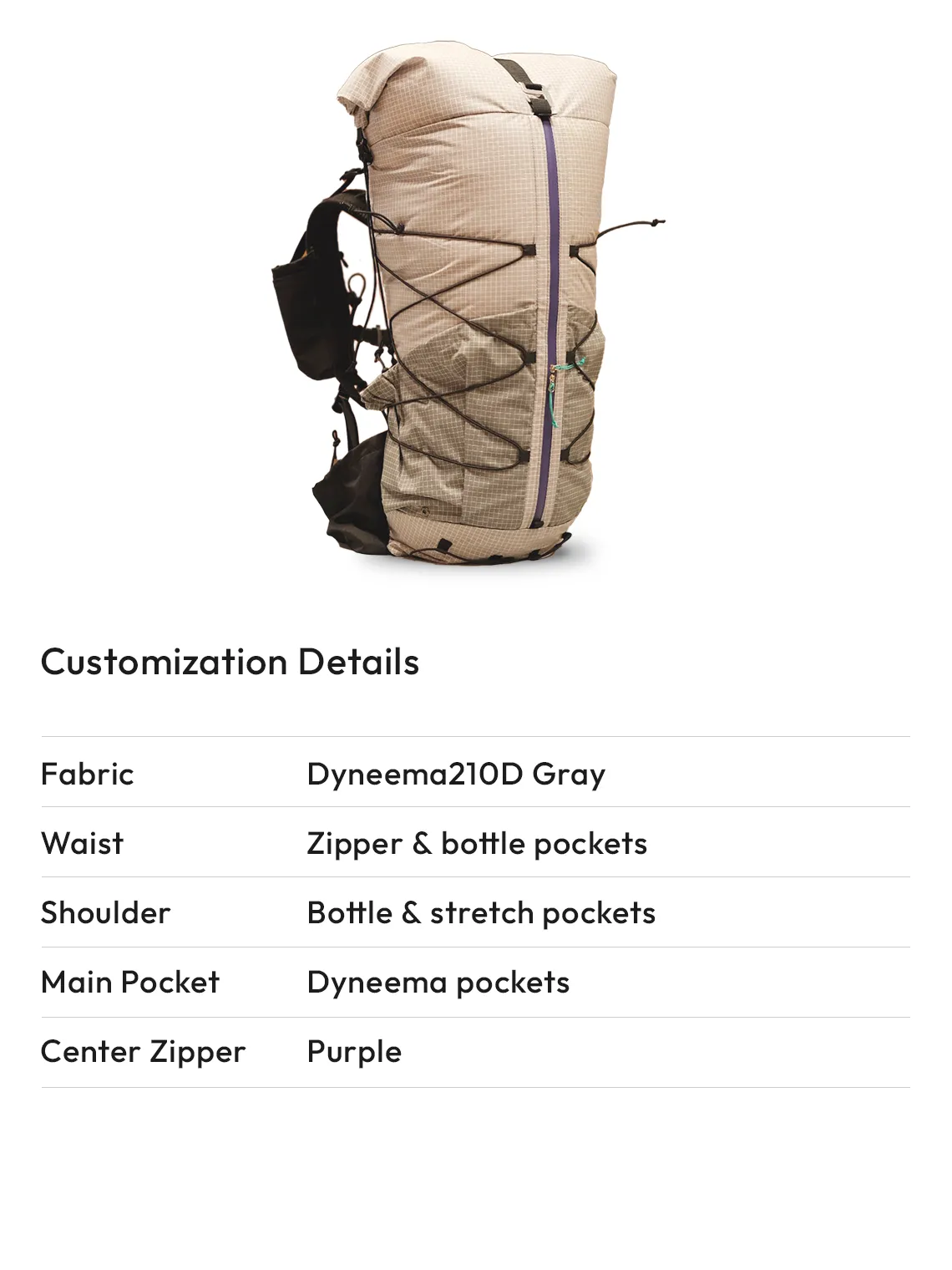 You can choose the type and color of the base fabric for your backpack from options such as Dyneema 140d/210d, and ULTRA200.