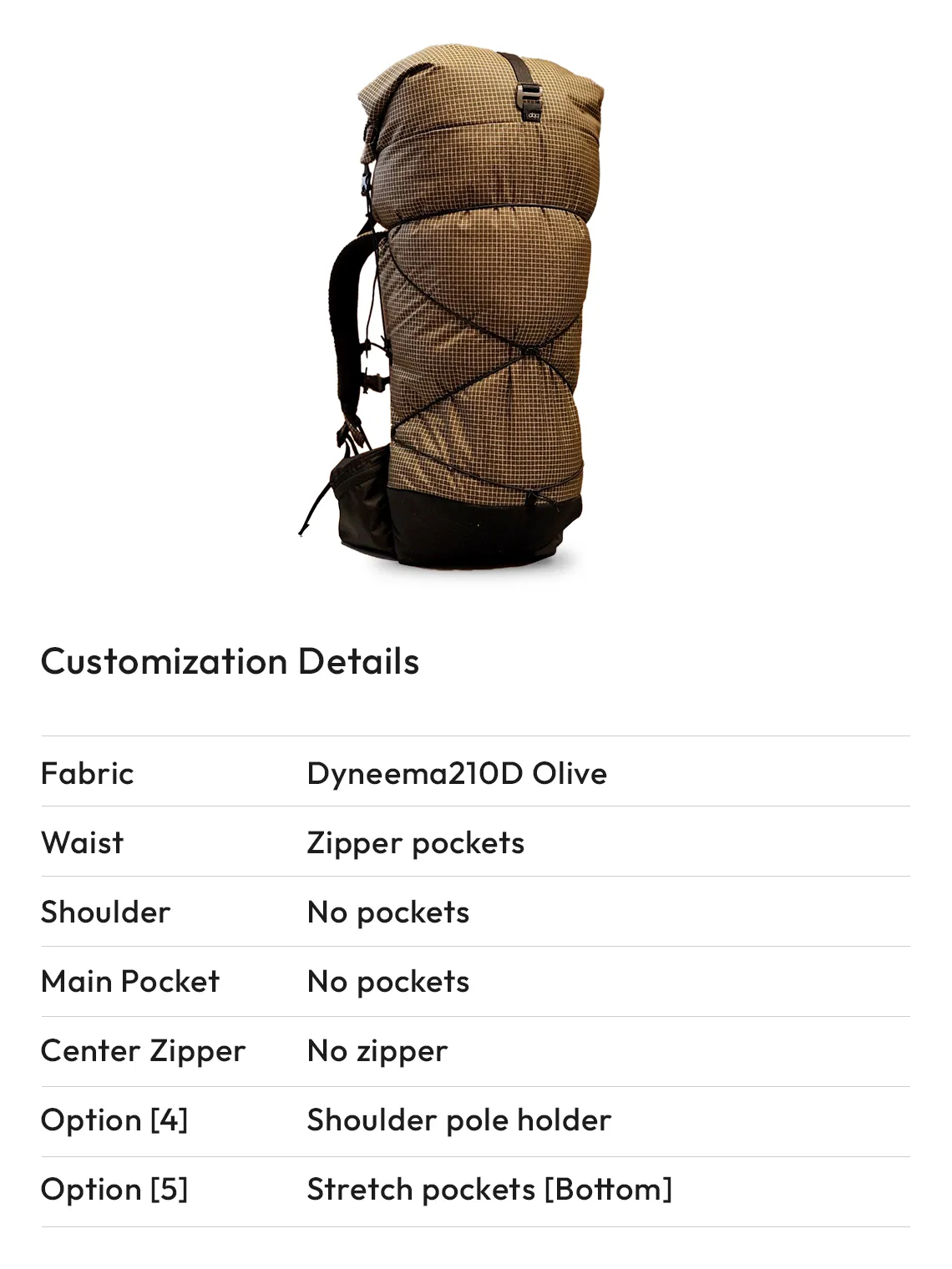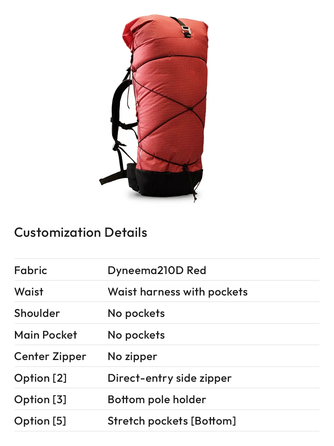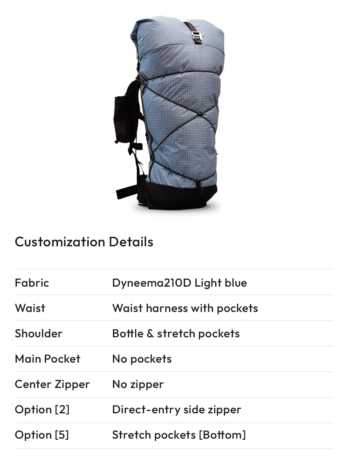 You can choose the type and color of the base fabric for your backpack from options such as Dyneema 140d/210d, and ULTRA200.