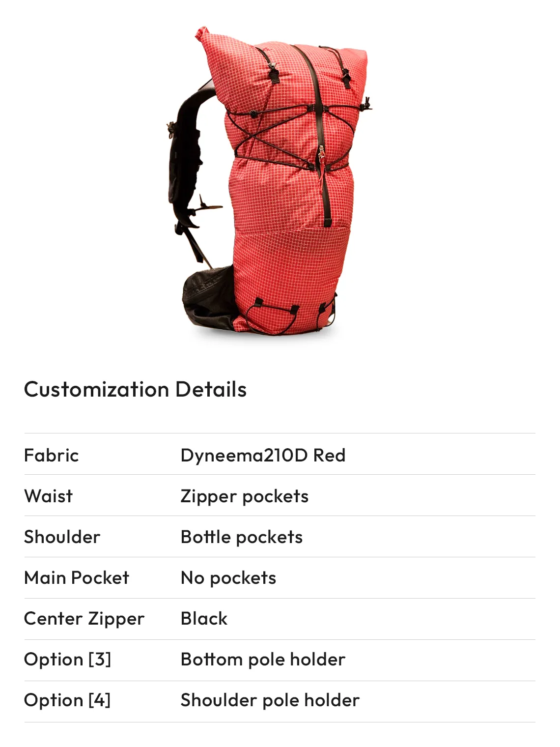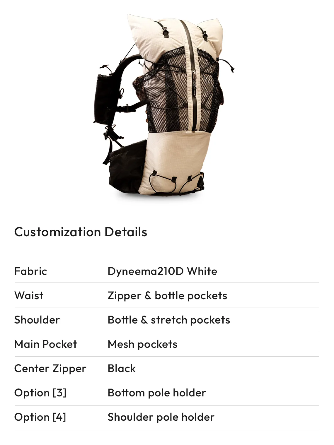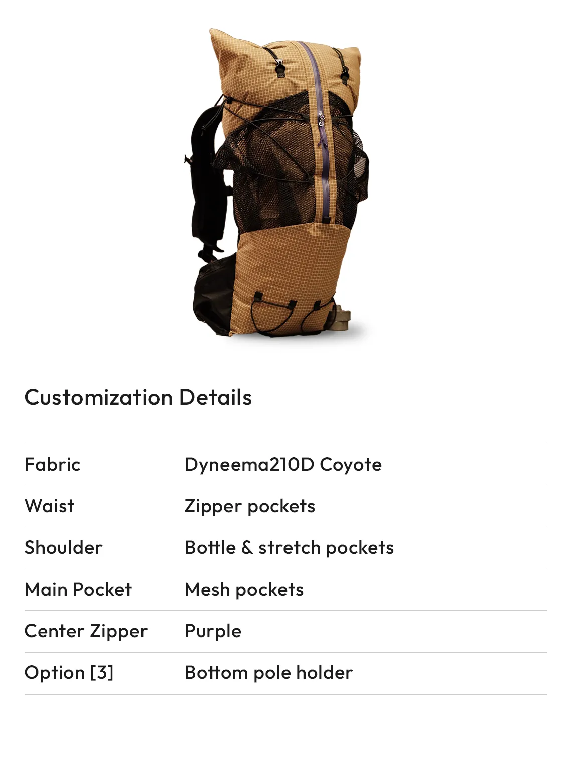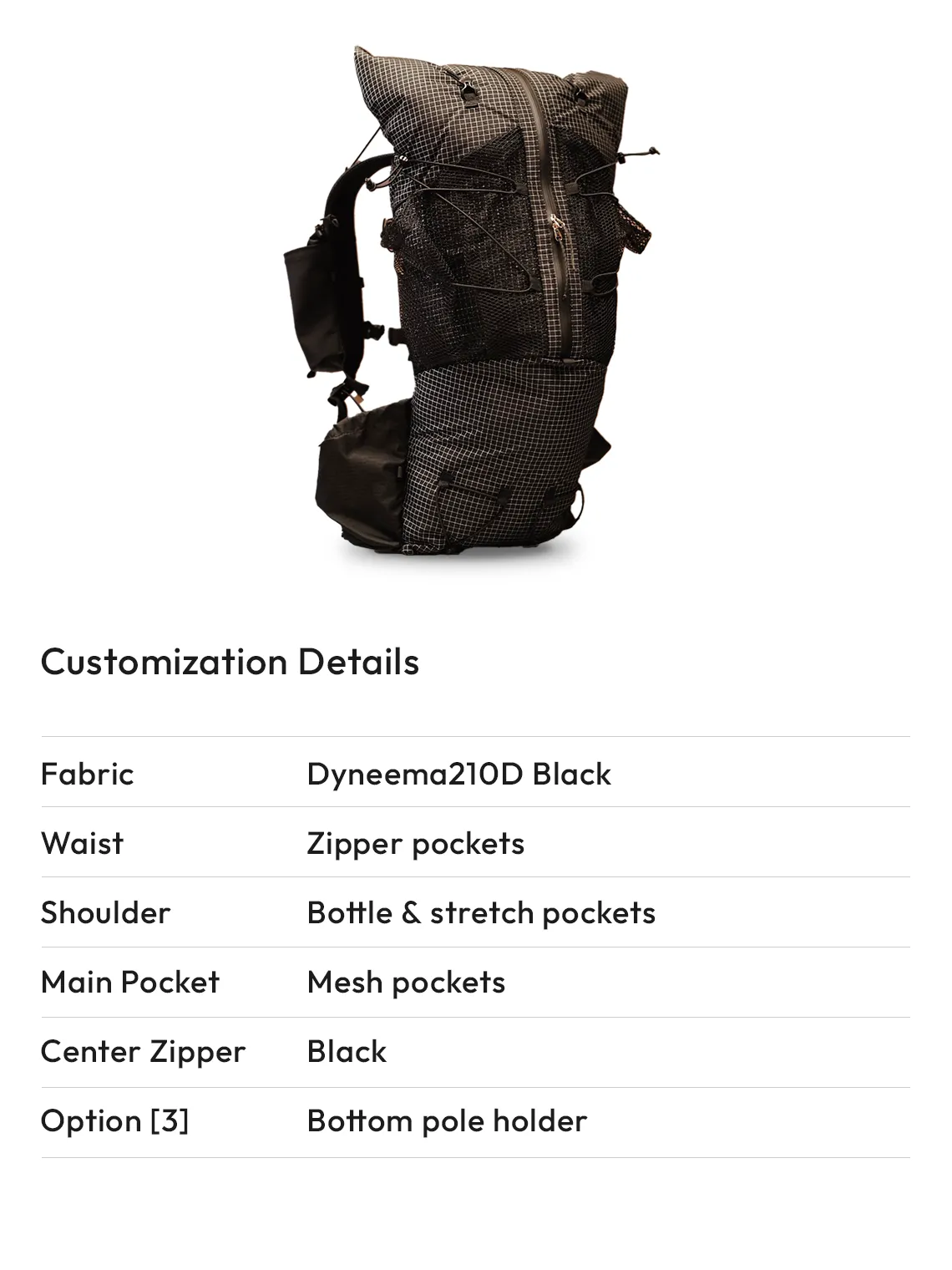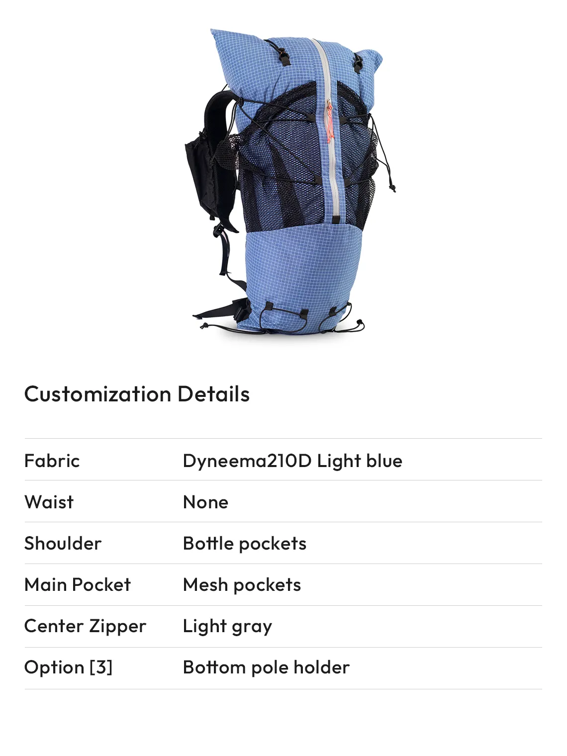 You can choose the type and color of the base fabric for your backpack from options such as Dyneema 140d/210d, and ULTRA200.