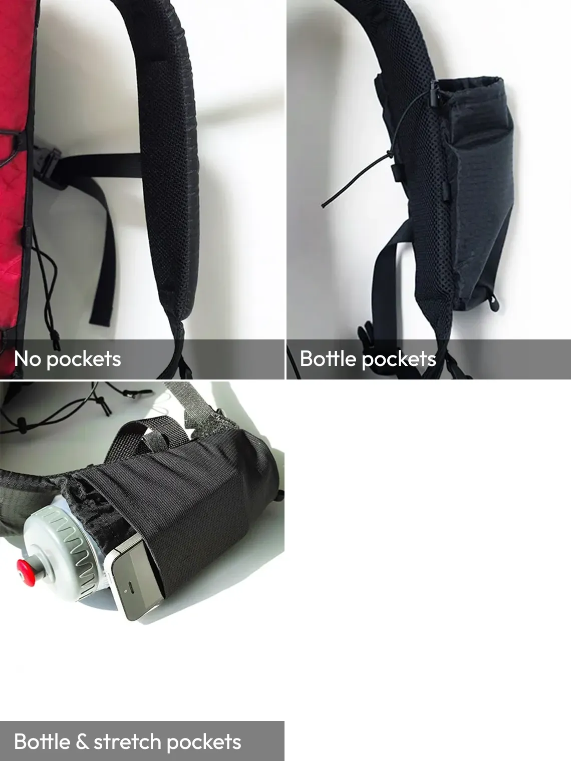 Optional additions include a waist belt, zip pockets, bottle pockets.